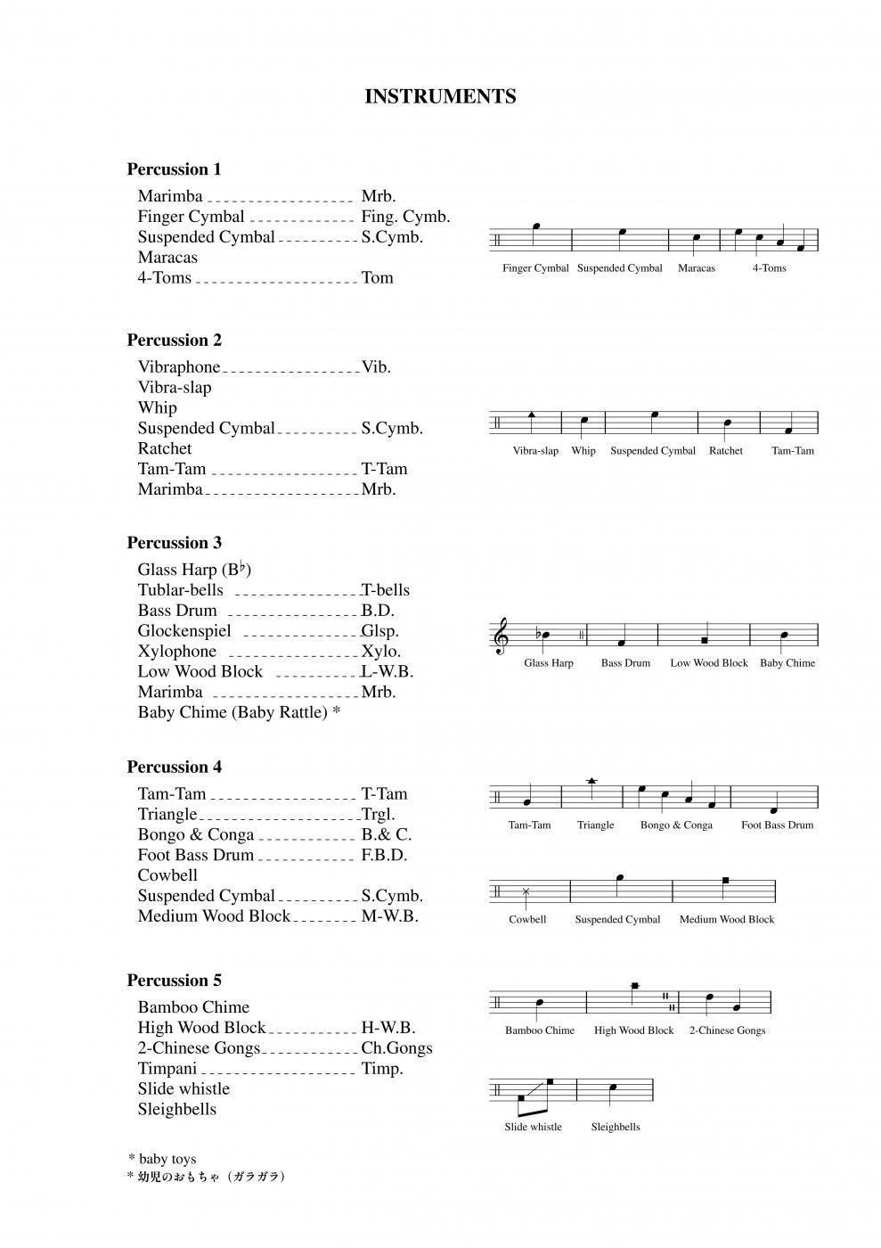 GlassHarp(B♭), / TubularBells, / BassDrum, / Glockenspiel, / Xylophone, / Low Woodblock, / Marimba, / BabyChime(Baby Rattle)=Baby toys 幼児のおもちゃ(ガラガラ)