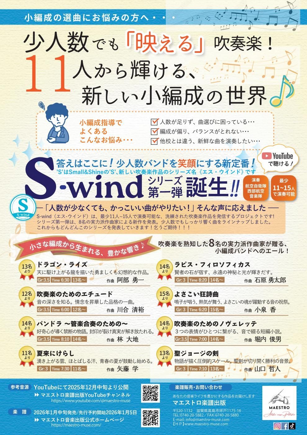 S-wind《エス・ウインド》は、最少11人〜15人で演奏可能な、洗練された吹奏楽作品を発信するプロジェクトです。